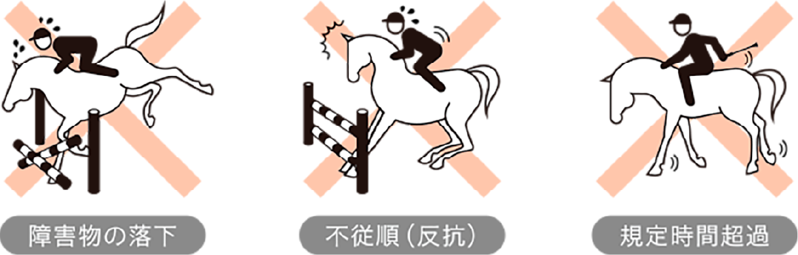 「標準競技」は、障害物を落下させると1回につき減点4、障害物の前で馬が止まってしまう(「反抗」と呼びます)と、1回目は減点4、2回目は「失権」となり、その時点で走行を終えなければなりません。規定時間内で減点が少ない人馬が上位となります。同点の選手が複数いた場合は、障害物を減らした「ジャンプオフ」という1位決定戦で、再度競います。