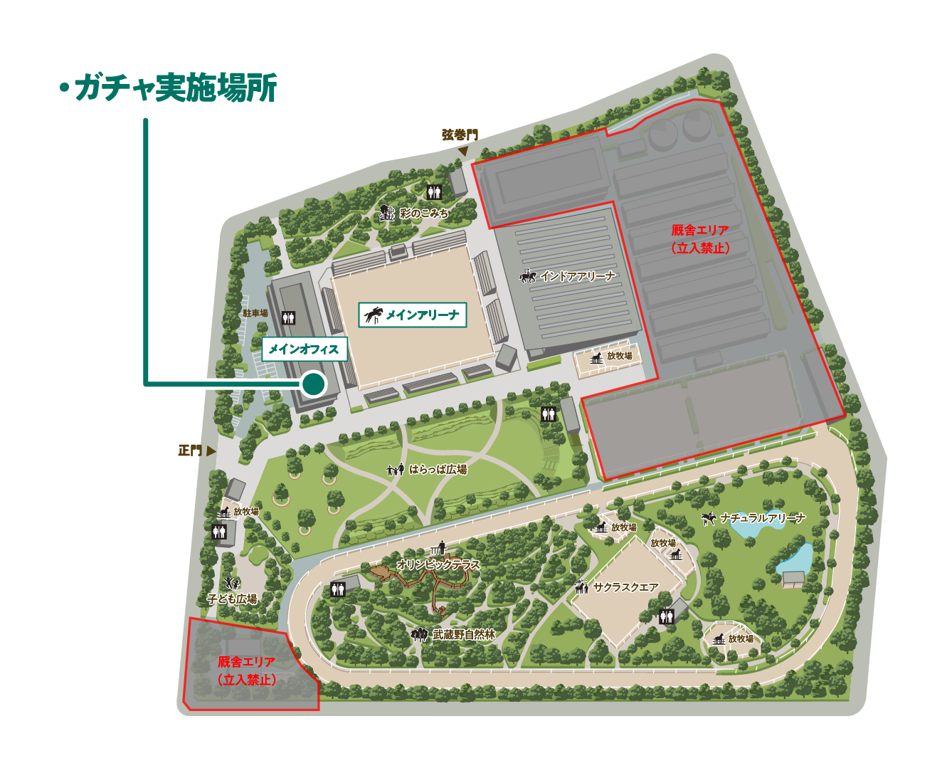 ・観客席やラチ(柵)の外側からのご観戦・撮影をお願いします。厩舎地区や待機馬場を含むアリーナへの立ち入りはできません。